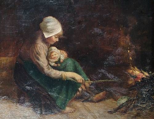 A young woman with a child before a fire