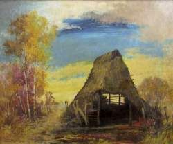 Baumbestandene Flusslandschaft mit Schilfhütte am Ufer