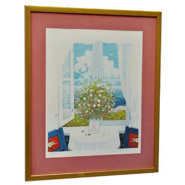 Motiv av interiör med bord och krus med blommor framför öppet fönster mot blåmolnig himmel