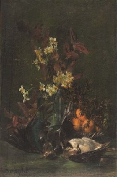 Still life - A glass vase of flowers, a bowl of fruit and game birds