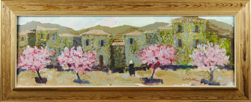 Sydländsk stadsbild med blommande träd