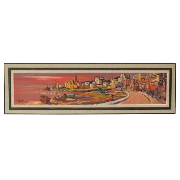 Panorama av sydländsk stad vid kusten.