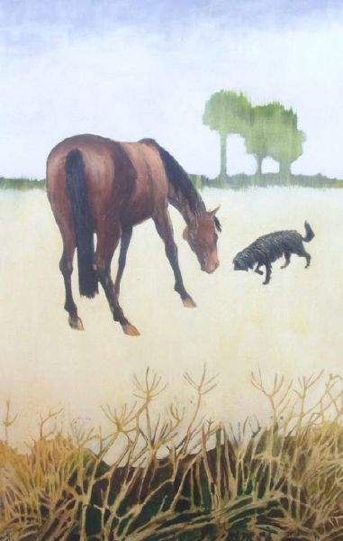 Horse and dog in landscape
