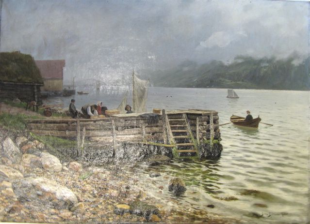 | Dock scene with woman and men handling baskets, sail/fishing boats in the distance | |