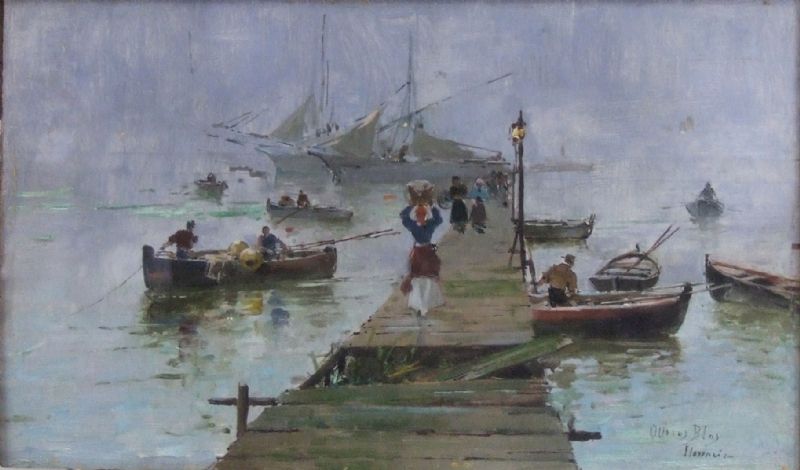| Fishing boats and figures on a wooden jetty, other ships to background | |