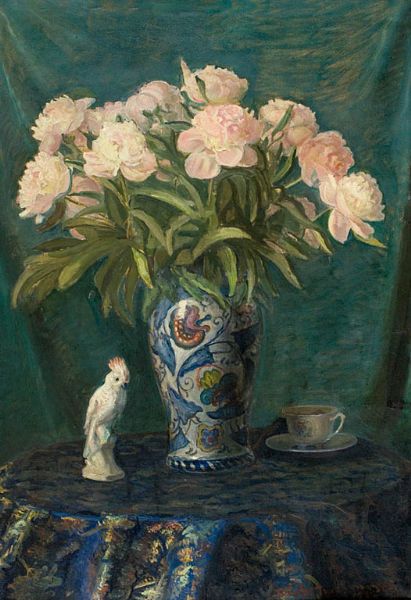 MARTWA NATURA Z BUKIETEM PEONII I FIGURKĄ PAPUGI, 1958
