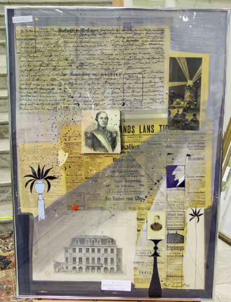 Komposition med tidningsklipp, bilder och text