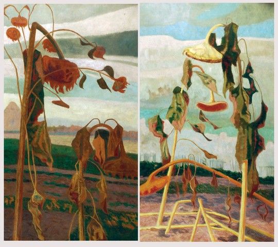Pole słoneczników wczesną jesienią- para obrazów