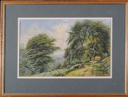 A MAN AND HIS DOG BY A WOODLAND TRACK