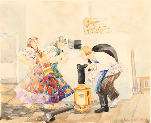 Kitchen interior with a Russian peasant heating his boot on the samovar