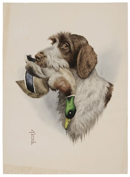 Portrait of a Wirehaired Pointing Griffon with Duck