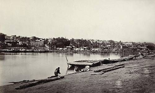 | Muttra from the opposite bank of the Jumna, bridge of boats in the foreground, 1870s | |