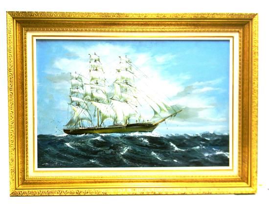 depicts large sailing vessel cutting through choppy waters and a cloudy sky