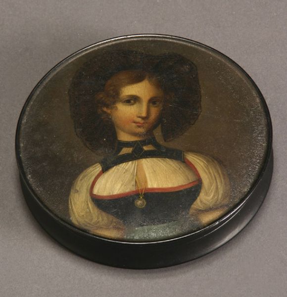 | German Painted Black Lacquered Papier-Mâché Tobacco Box with a Portrait of a Woman | |