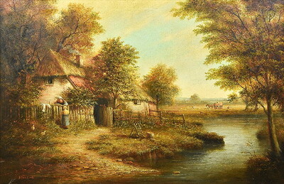 Riverside Cottage with Figures Harvesting Beyond