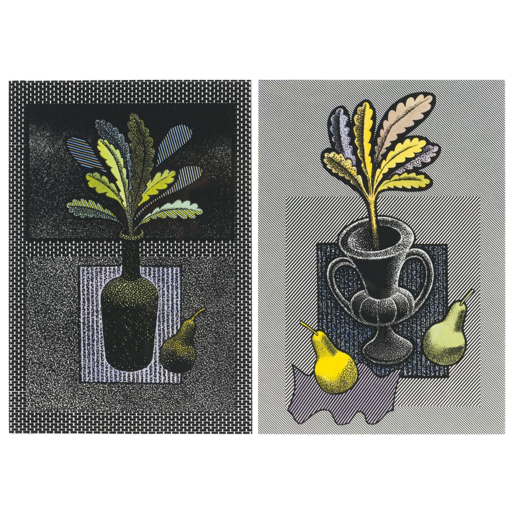 | Blue Vase, Yellow Plant; Black Bottle, One Pear, two | |