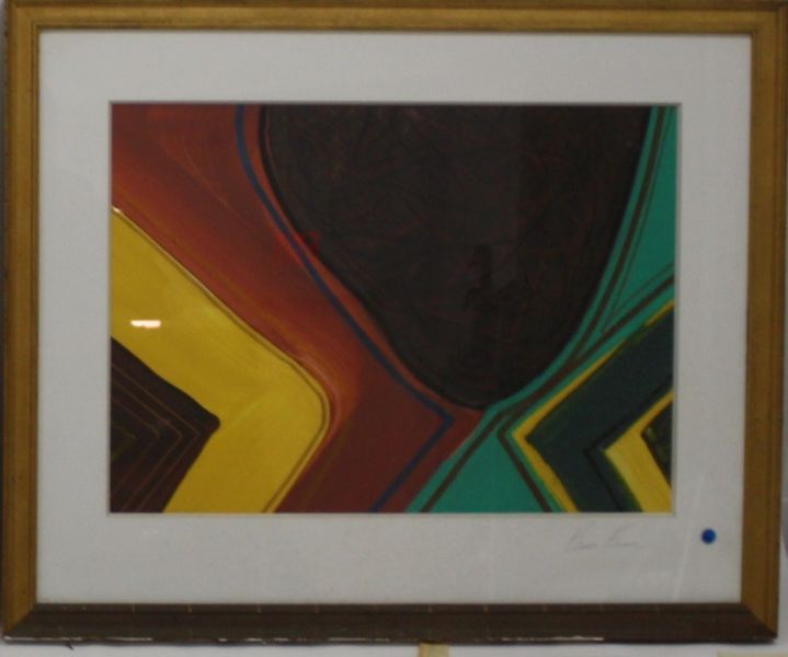 In aquas, rust, and yellow. Signed on mat Bruce Brown