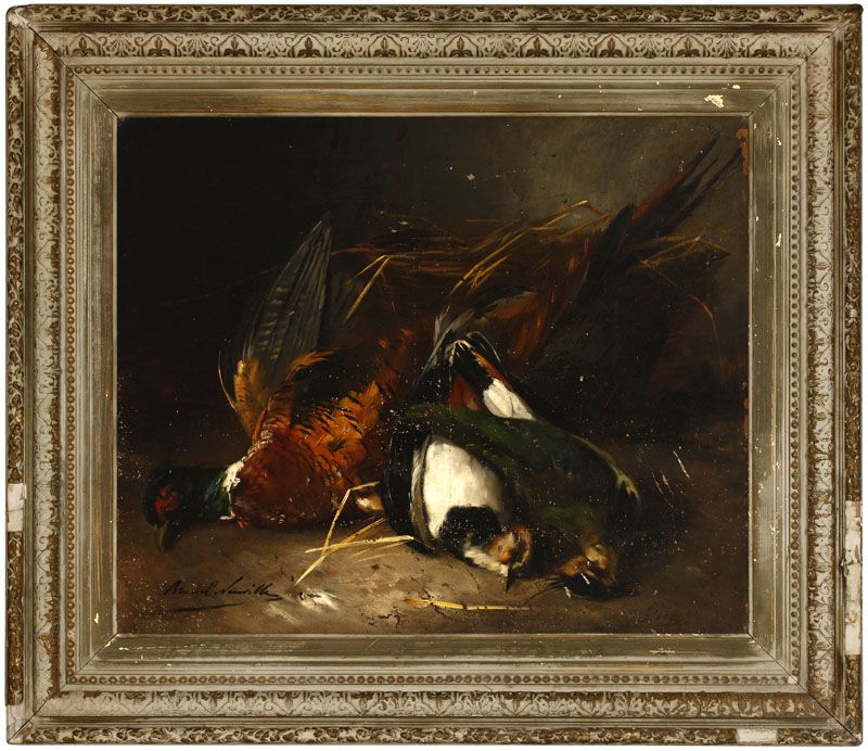 | Still life with fowl and a basket affixed with a sign in Italian | |