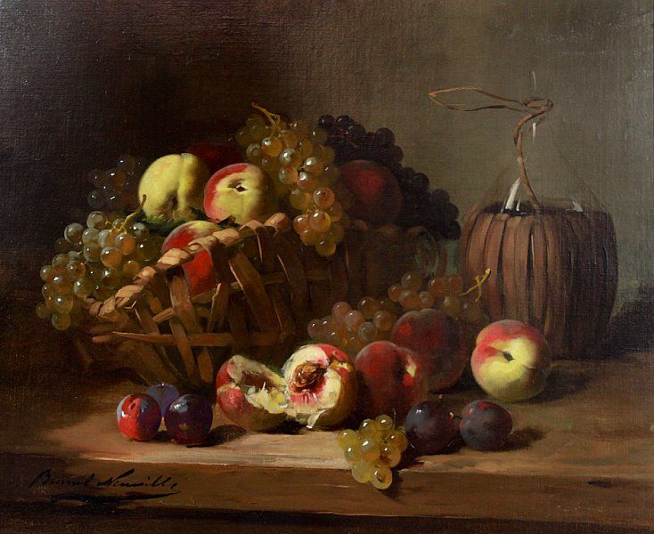 STILL LIFE OF WINE BOTTLE, PEACHES AND GRAPES