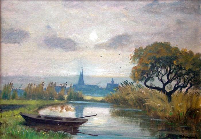 | Nächtlicher Flusslauf mit ankerndem Ruderboot, im Hintergrund Stadtsilhouette.Nächtlicher Flusslauf mit ankerndem Ruderboot, im | |