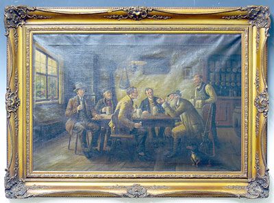 Wirtshausinterieur mit fünf Zechern und Wirt