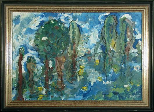 Abendliche Flusslandschaft am baumbestandenen Ufer