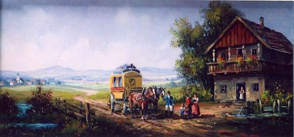 Bayerische Landschaft mit Gasthof und Postkutsche