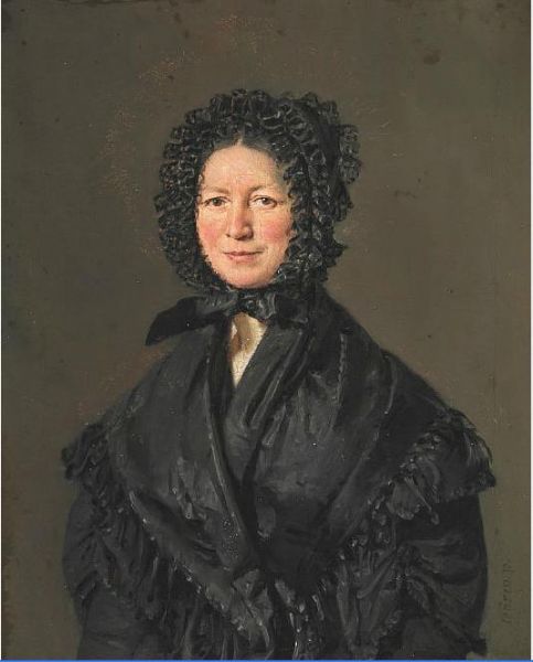 Portrait of Mrs. Henneberg in a black coat, black shawl and bonnet