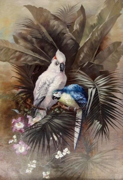 EXOTIC BIRDS AMIDST TROPICAL SHRUBS