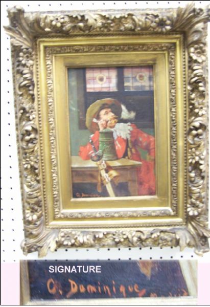 | A cavalier seated at a table with a stein and his sword leaning against table | |