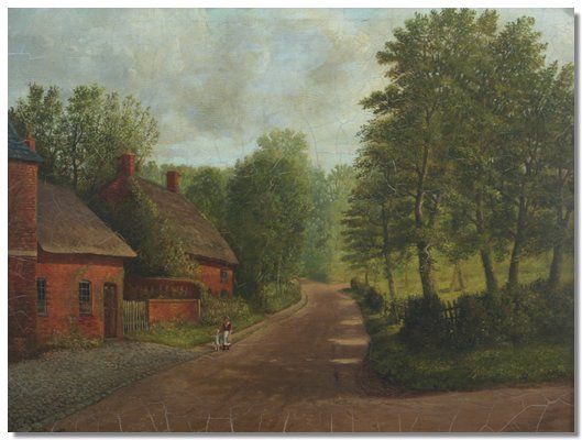 Mother and child on a path by thatched cottages and woods beyond