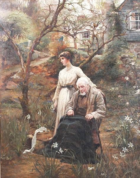 Study of a woman and her elderly father in a cottage garden "Twixt Love & Duty",