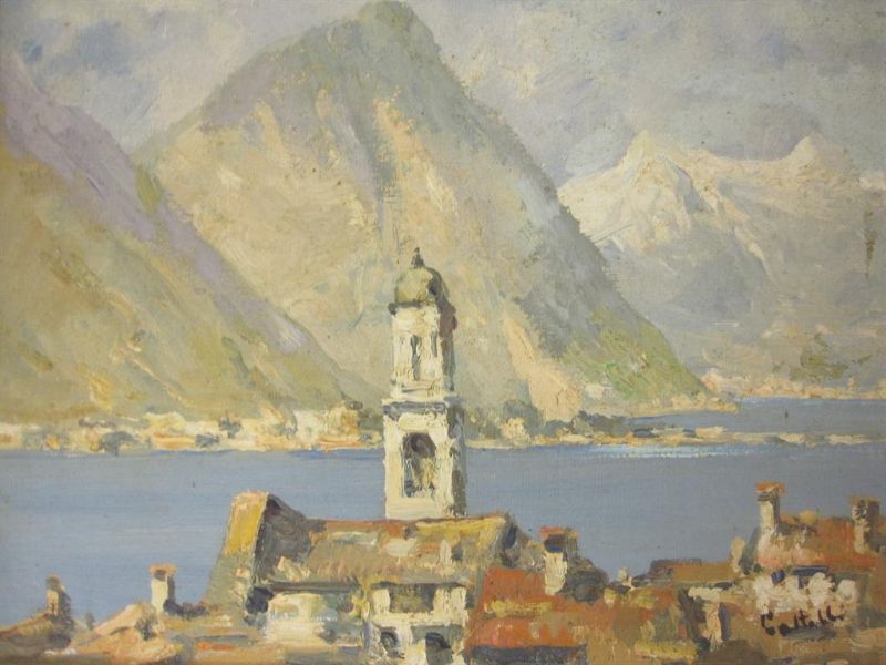 A Continental Lake Scene with tower in foreground