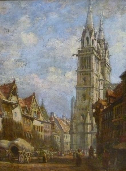 | A Continental market square scene, with carts and figures in the foreground and two spire church behind | |
