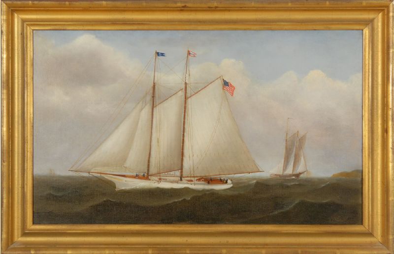 Yachting scene with a two-masted yacht flying an American flag and a ship's flag initialed W.G.B