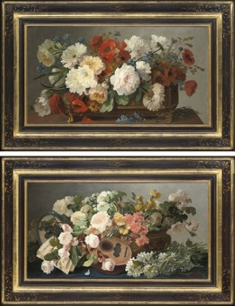 | Poppies, daisies, peonies and cornflowers in a rectangular jardinière; and Roses, lilac and carnations by a lute and a tambourin | |