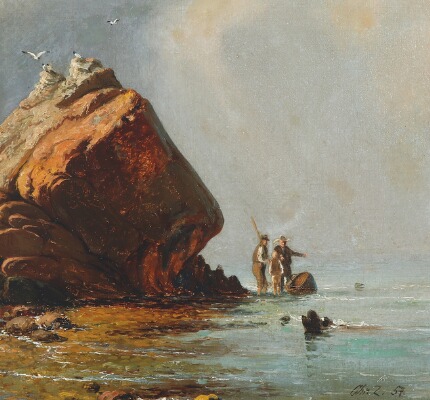 Coastal scene with fishermen among the cliffs.