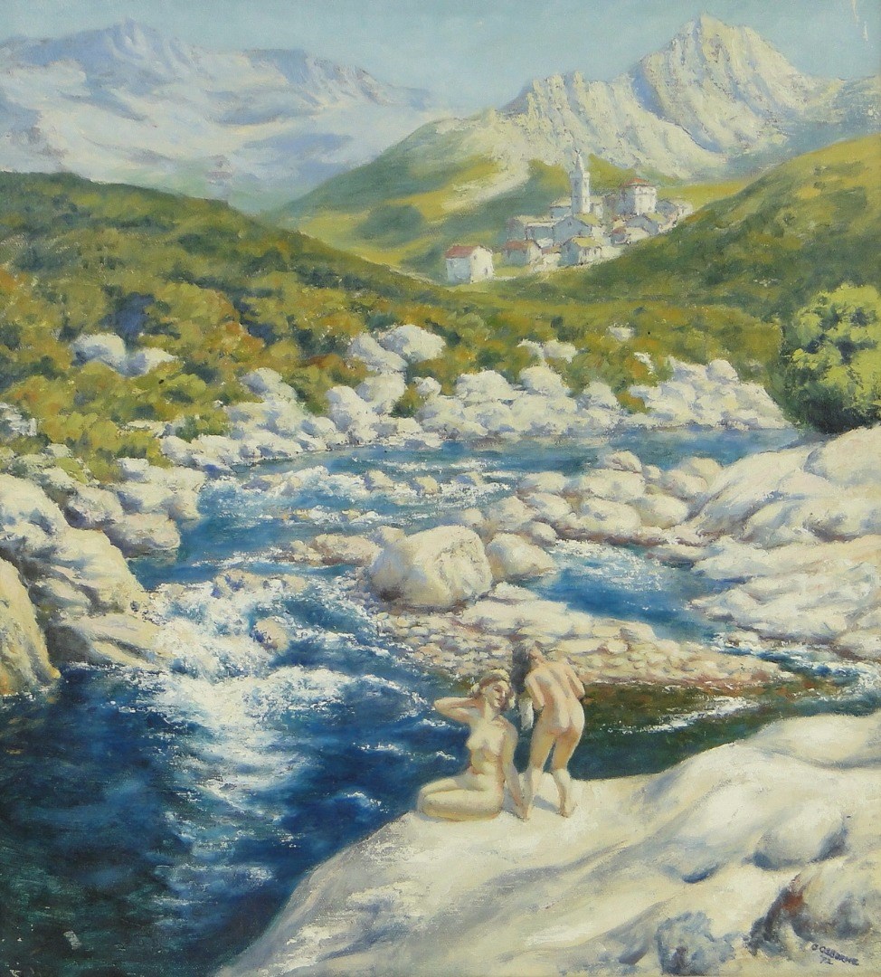 nude bathers in alpine landscape