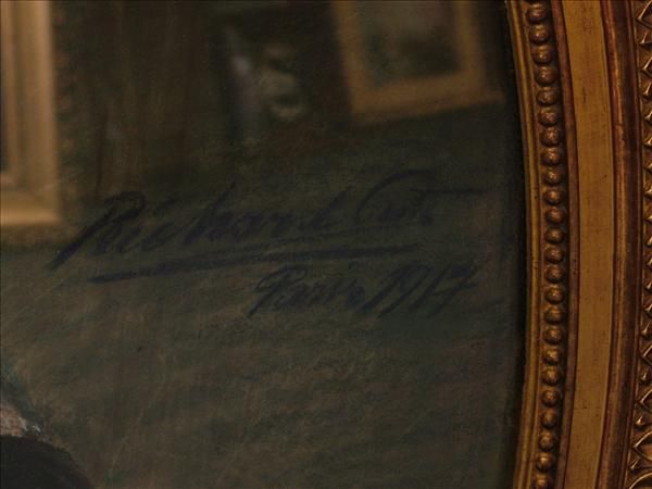 | Portrait of a lady, Half length standing, wearing a dark purple dress and pearls | |