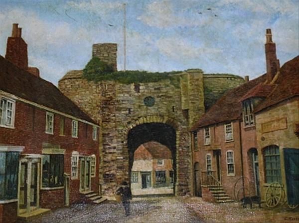 Figure before a mediaeval gatehouse