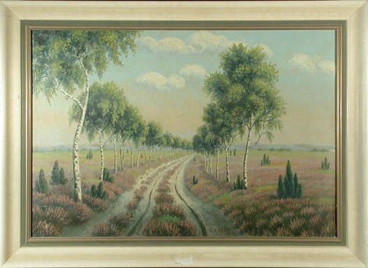 Birkenallee in weiter, norddeutscher Landschaft mit blühendem Heidekraut und Wacholdersträuchern