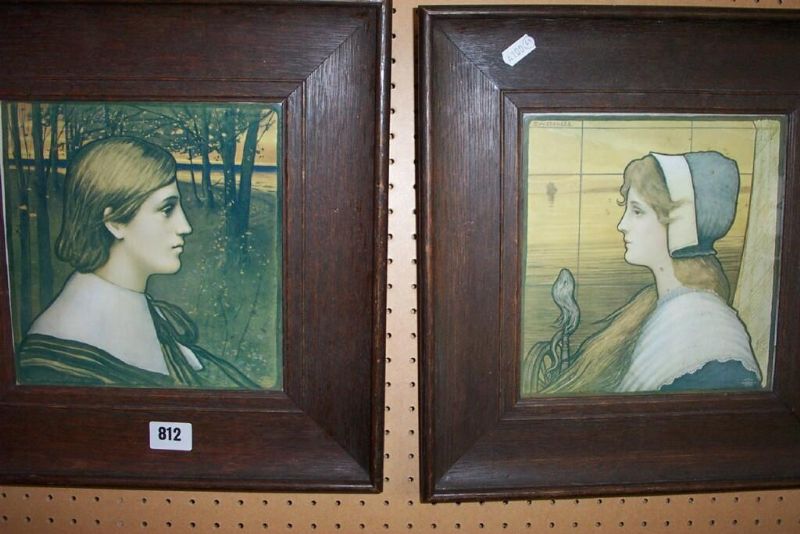 | profile portraits of a young woman with a spinning wheel and distant seascape and a young man in a landscape setting | |