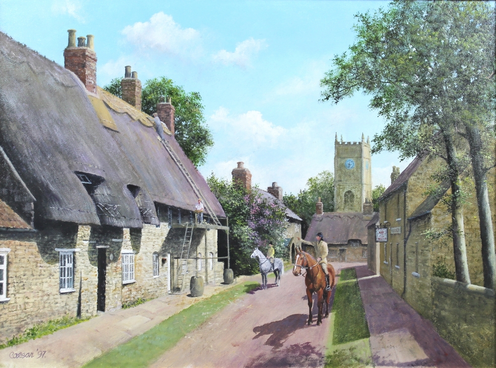 | Fotheringhay High Street with thatchers working, with two horses | |