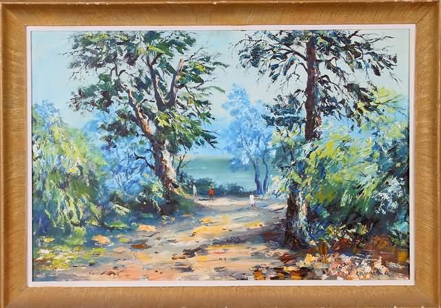 Landscape leading to the river, three figures walking