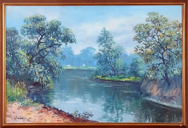 | River landscape with three large trees at the edge of the river | |
