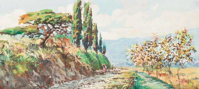 COUNTRY ROAD WITH PAESANT AND FLOCK