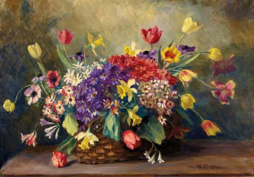 Stillleben mit Frühlingsblumen in Flechtkorb.