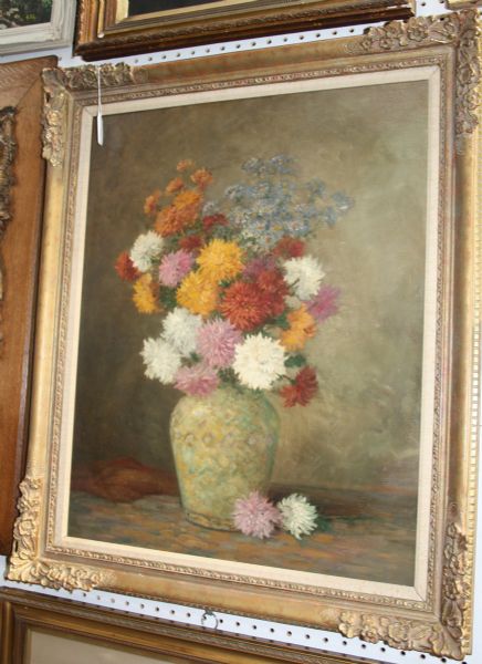 Still Life Study of Chrysanthemums and Michaelmas Daises in a Green Glazed Vase