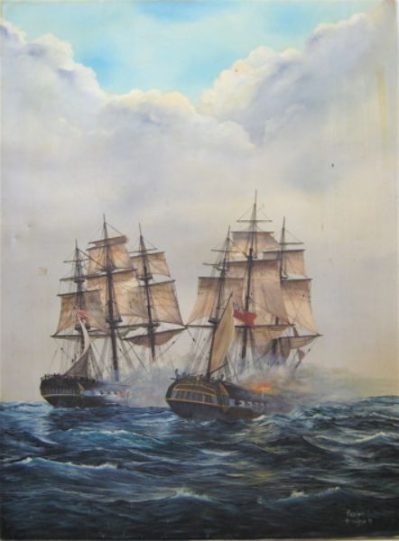 British man o'war and an American sailing ship in a sea battle