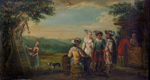 | 1. Eine elegante Gesellschaft beobachtet Bauern beim Pflanzen von Obstbäumen. 2. Eine elegante Gesellschaft besucht die Bauern z | |